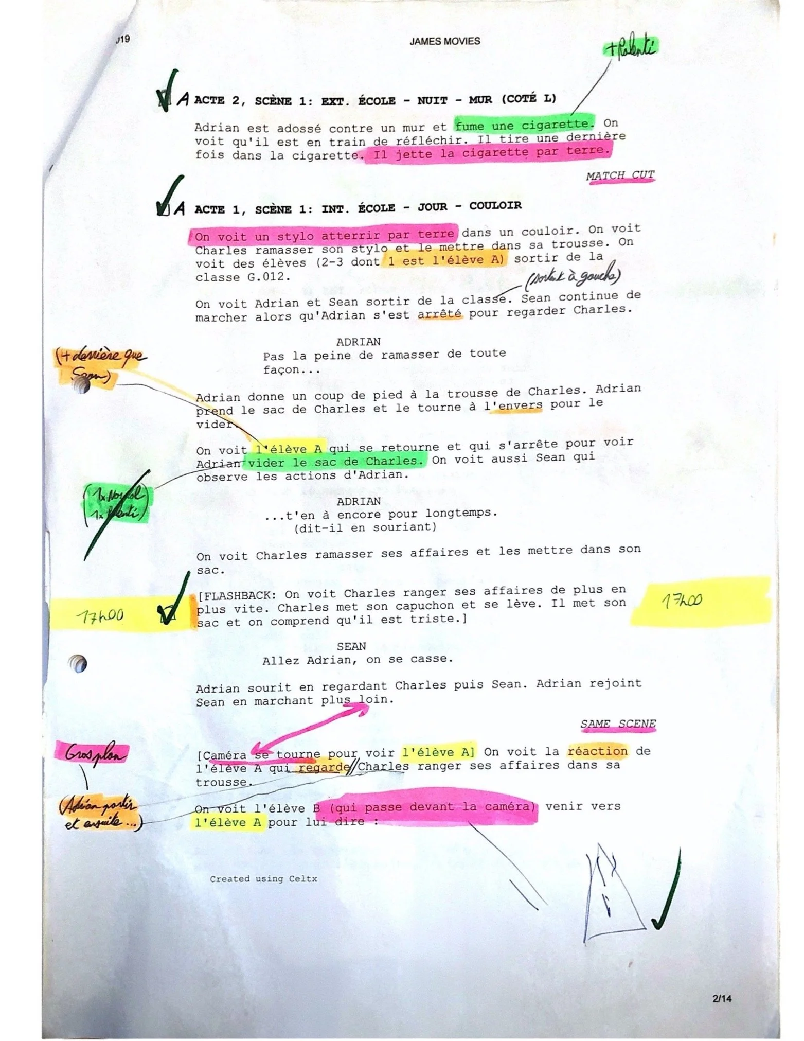 I annotated the script to not forget elements (orange), to point out the important aspects of certain scenes like if they included any transitions or special shots (pink), other notes on the go, and notes that required slow motion meaning the camera settings had to be changed (green).
